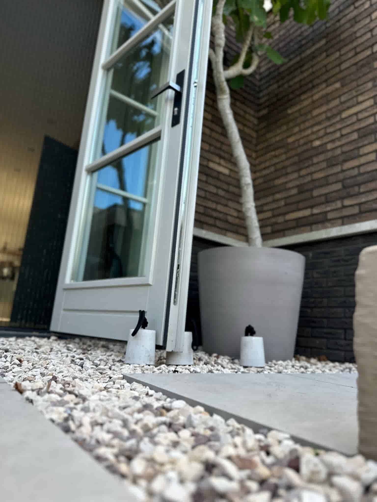 Leuke betonnen deurstoppers gekocht. Deze houden wel stand bij meer wind. Ze zijn niet extreem zwaar maar voldoen toch prima.