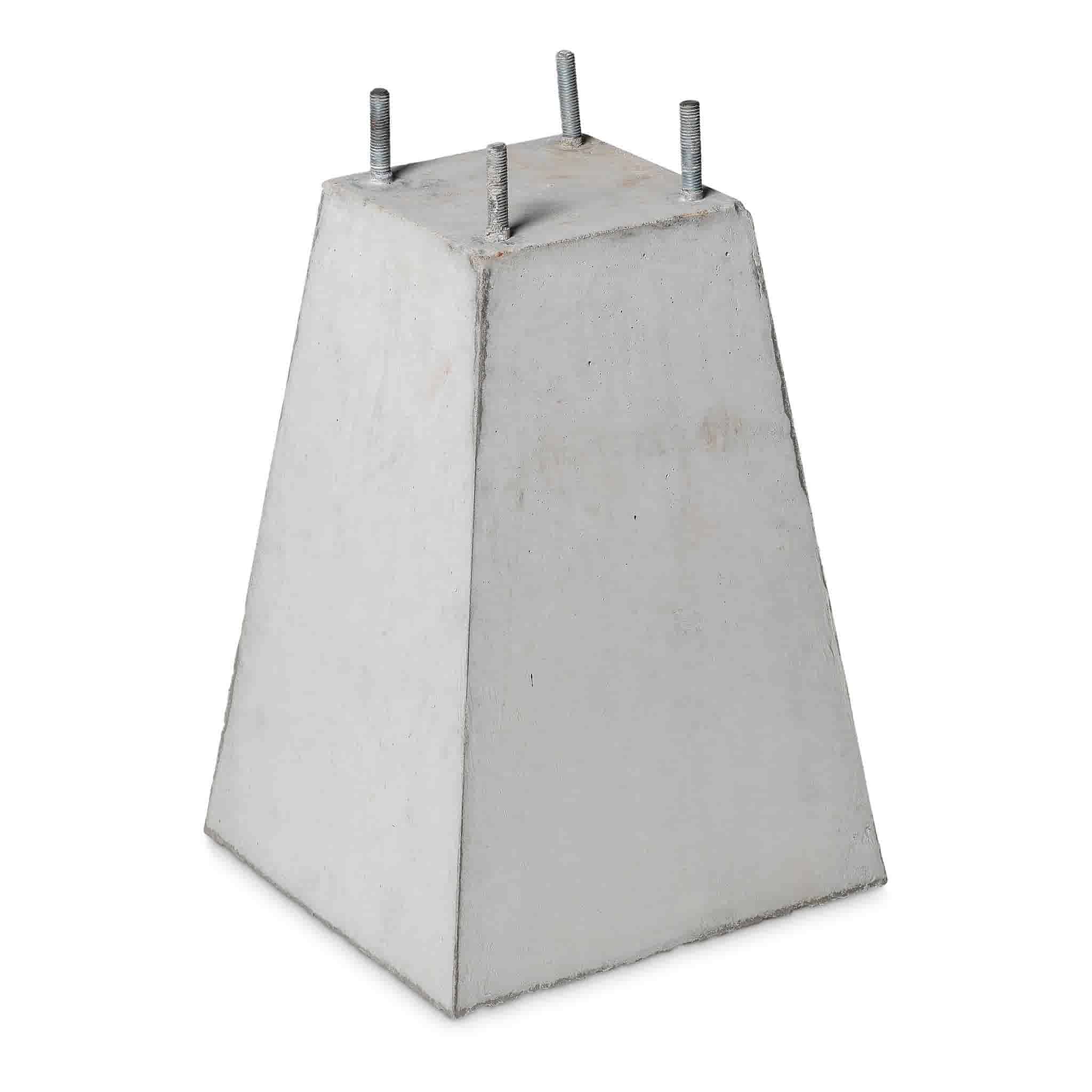 Hoogte: 35 cm Bovenkant: 15x15 cm Kopmaat: nvt Onderkant: 25x25 cm Vellingkant: nee Draadeind, schroefhuls of gat: 4 draadeinden M10, steken 4 cm uit (verschillende opties hoh maten) Gewicht: ca. 30 kg Kleur: grijs Soort beton: zelfverdichtend beton -