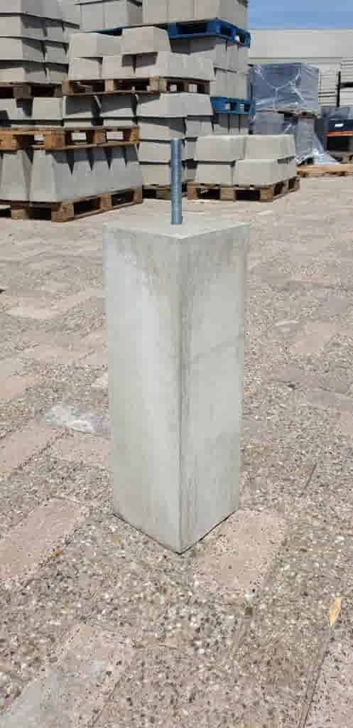 Hoogte: 50 cm Bovenkant: 15x15 cm Kopmaat: nvt Onderkant: 16x16 cm Vellingkant: nee Draadeind, schroefhuls of gat: 1 draadeind M16, steekt 10cm uit de poer Gewicht: 25 kg Kleur: grijs Soort beton: zelfverdichtend beton -