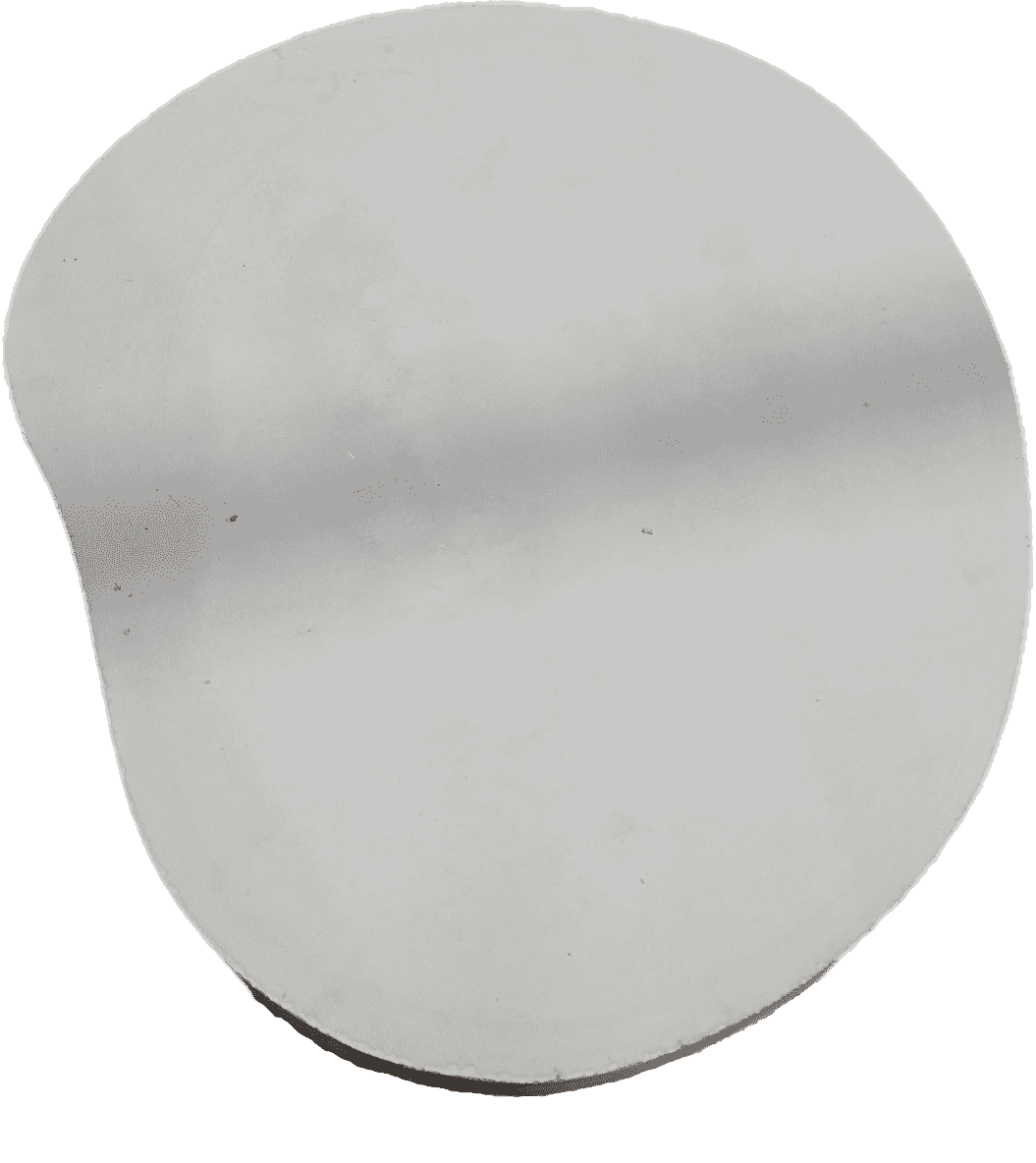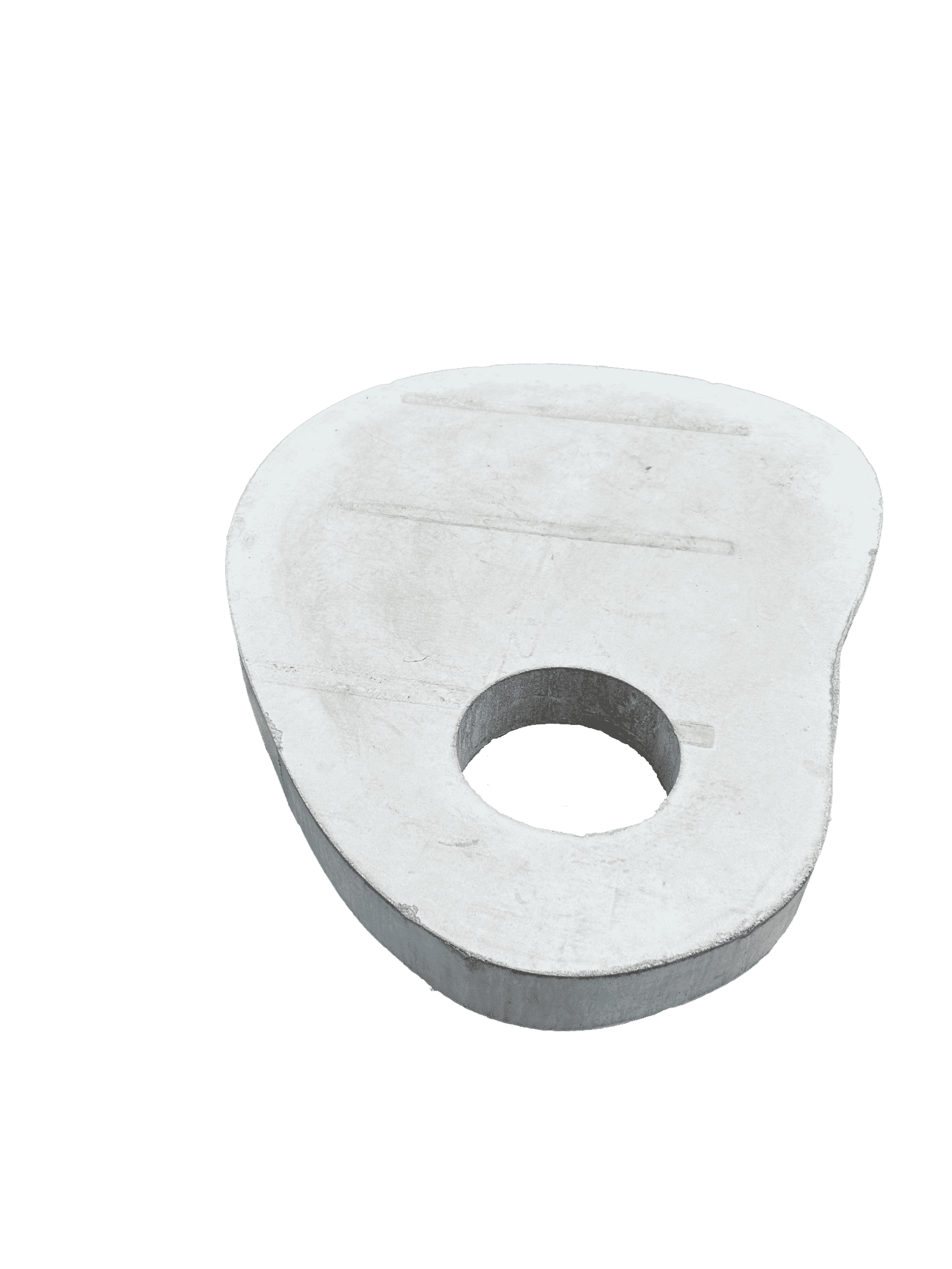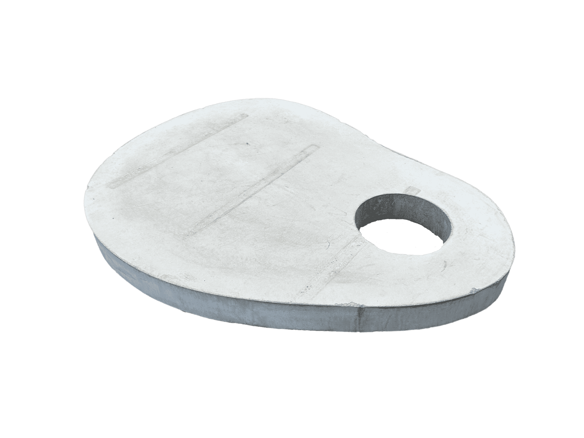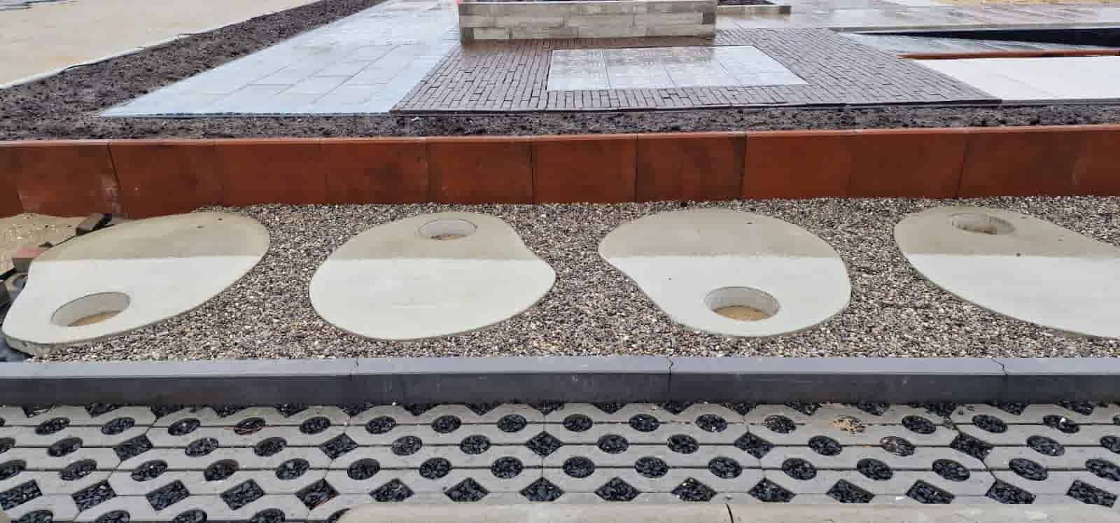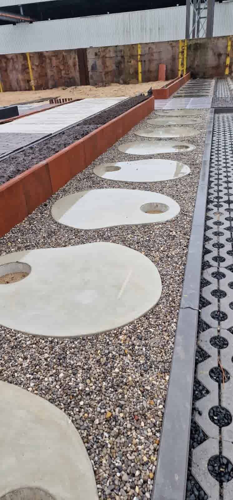Organische tegels van zelfverdichtend beton. Bovenstaande ietwat ovale tegel heeft een afmeting van ca. 100x120 cm, de dikte van de tegel is 9 cm. Deze tegel is zowel met gat van 25 cm, als zonder gat verkrijgbaar.